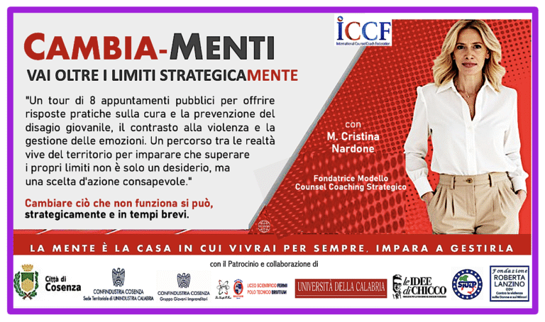 Nasce da questa urgenza il tour “CAMBIA-MENTI – Vai oltre i limiti strategicamente”, un’iniziativa di alto profilo voluta dall’ICCF (International Counsel Coach Federation) in collaborazione con il Nardone Group. Non un semplice ciclo di conferenze, ma un vero e proprio “attacco frontale” ai limiti che bloccano la crescita di persone, aziende e istituzioni.